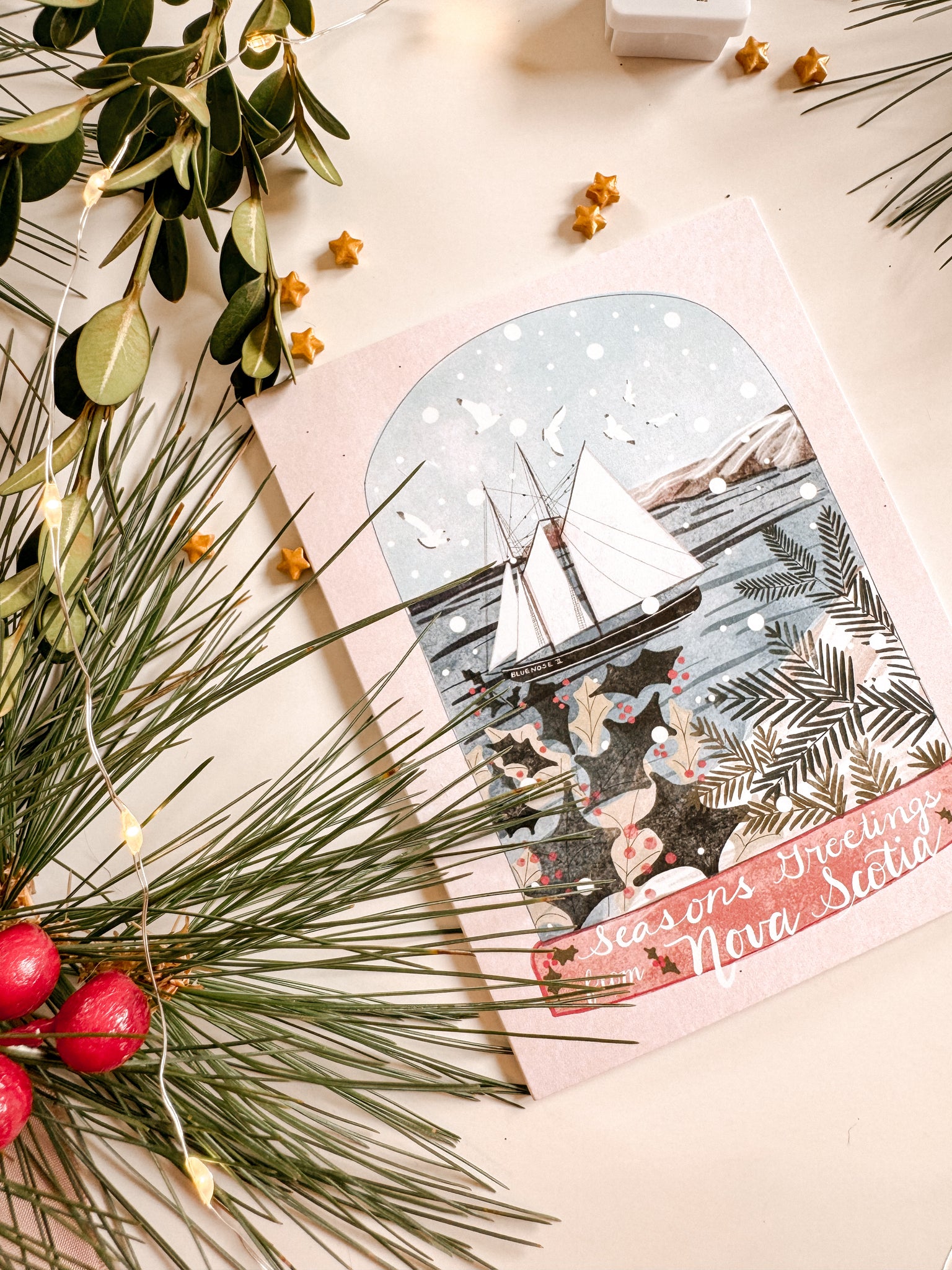 Our Season’s Greetings from Nova Scotia Holiday Card depicts a picturesque scene of the Bluenose II on Nova Scotia waters, viewed through the veil of a light flurry and evergreens, is my idea of a true Maritime moment.