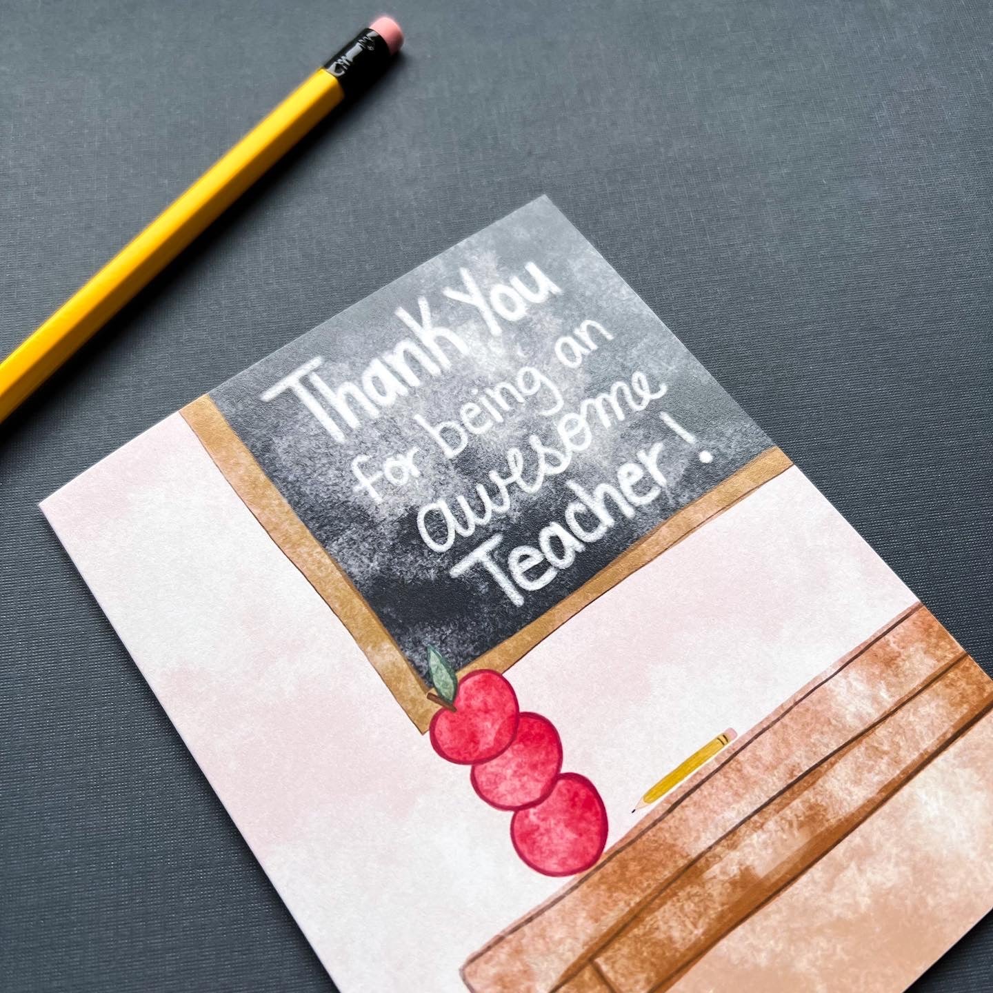 Show your favourite Teacher your gratitude with our nostalgic Teacher Appreciation card! Hand drawn original art Blank inside 4.25” x 5.5” vertical folded greeting card Each card comes with a kraft envelope. No returns, exchanges, or refunds on...Read more