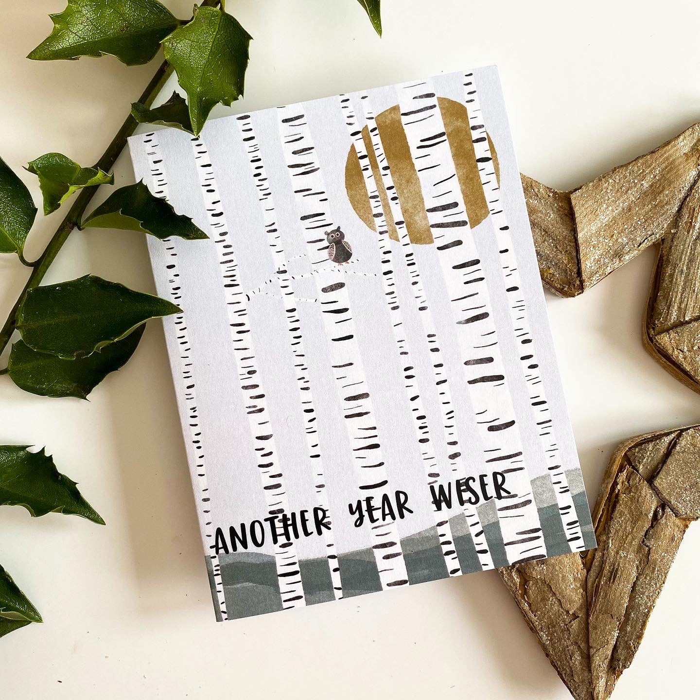A cutie owl sitting among the birches is the perfect way to send a Birthday wish! Hand illustrated inside art completes this unique card.