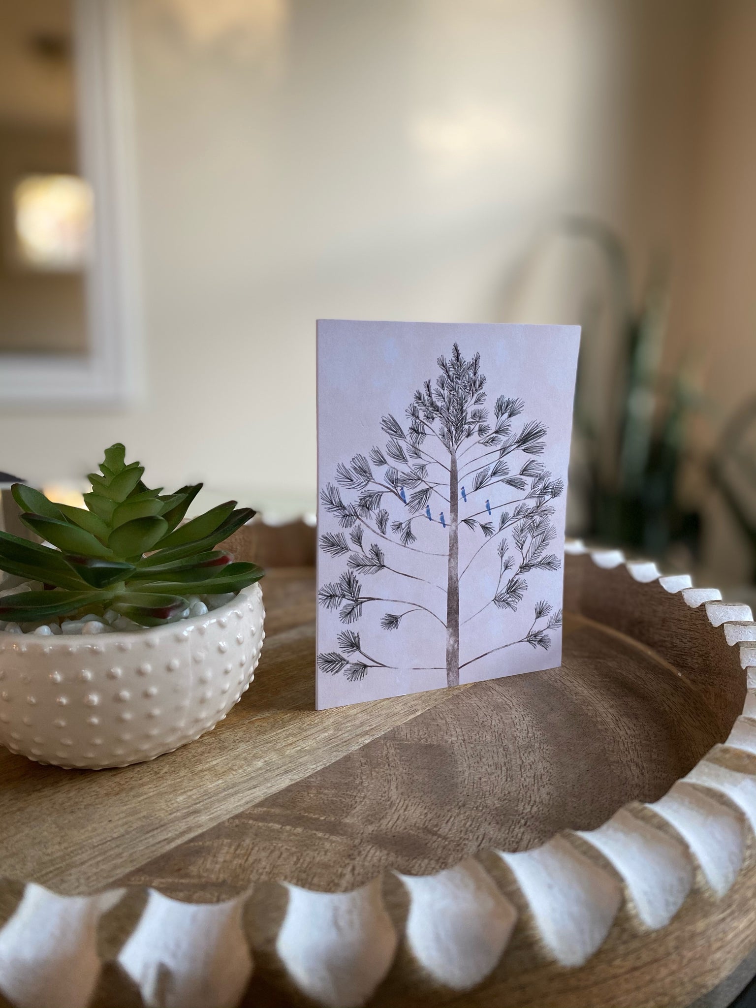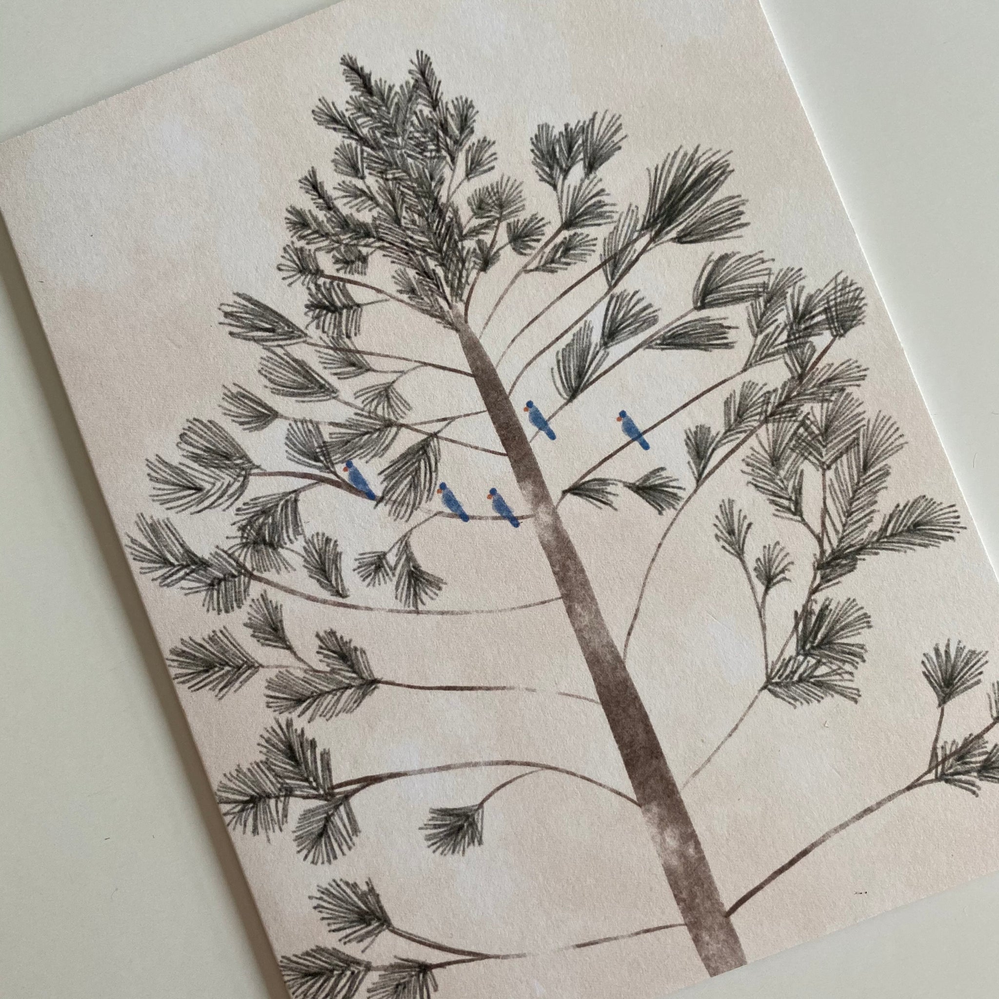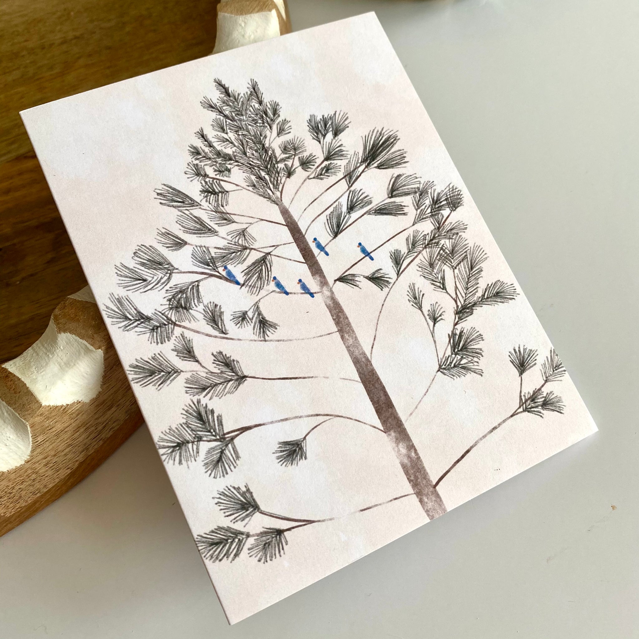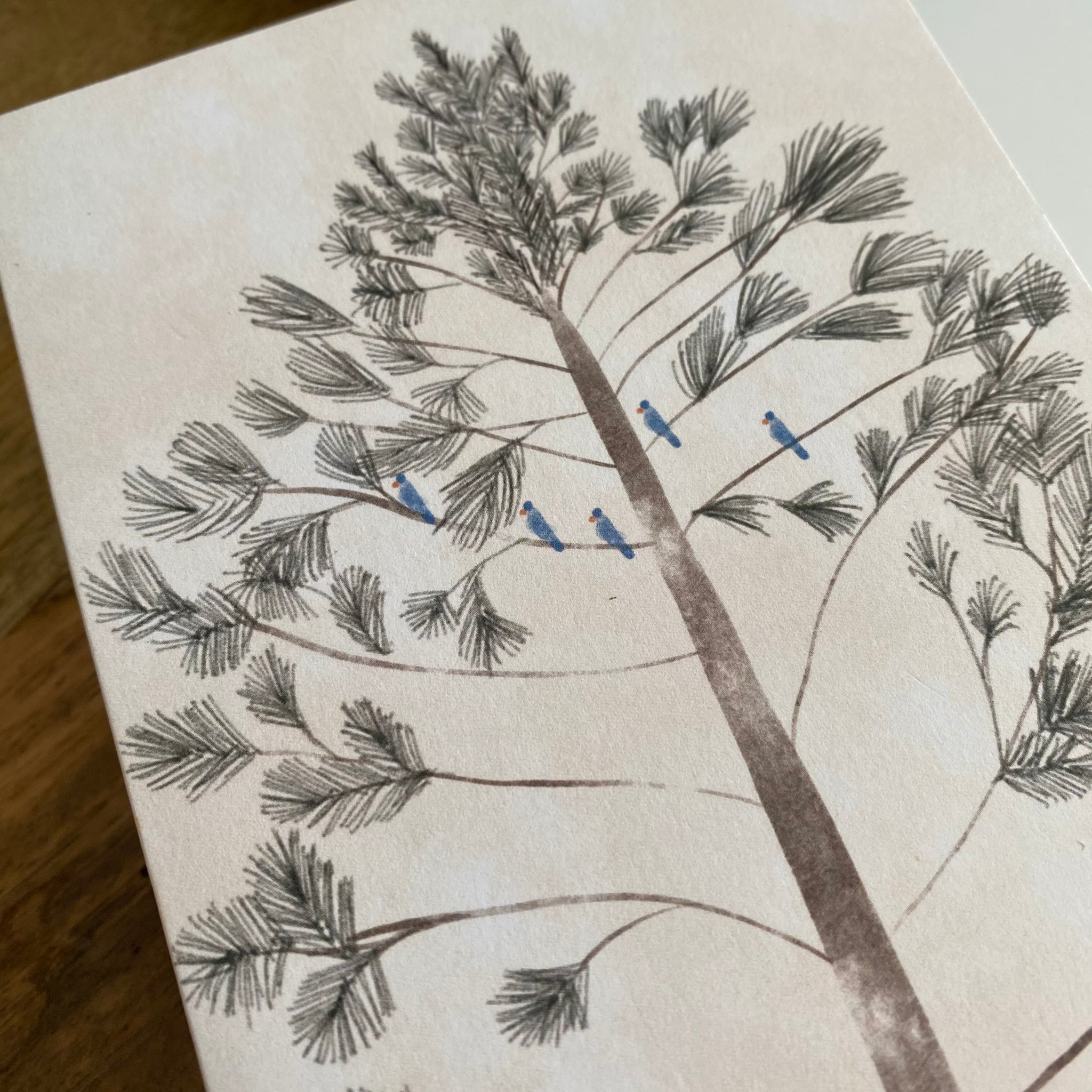 This painting is inspired by the beautiful, ancient pine in our yard. The blue jays sit high up in the branches looking far out over the ocean, creating the most tranquil scene. Hand drawn original art 4.25” x 5.5” vertical folded...Read more