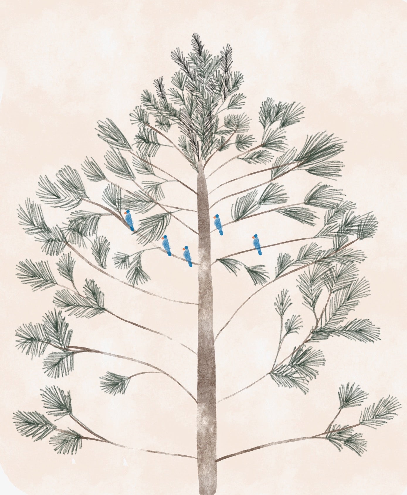 This painting is inspired by the beautiful, ancient pine in our yard. The blue jays sit high up in the branches looking far out over the ocean, creating the most tranquil scene.