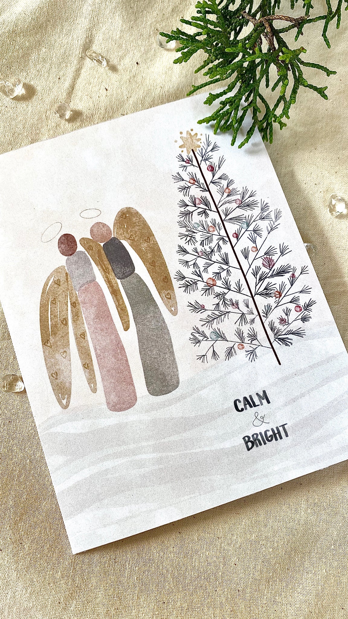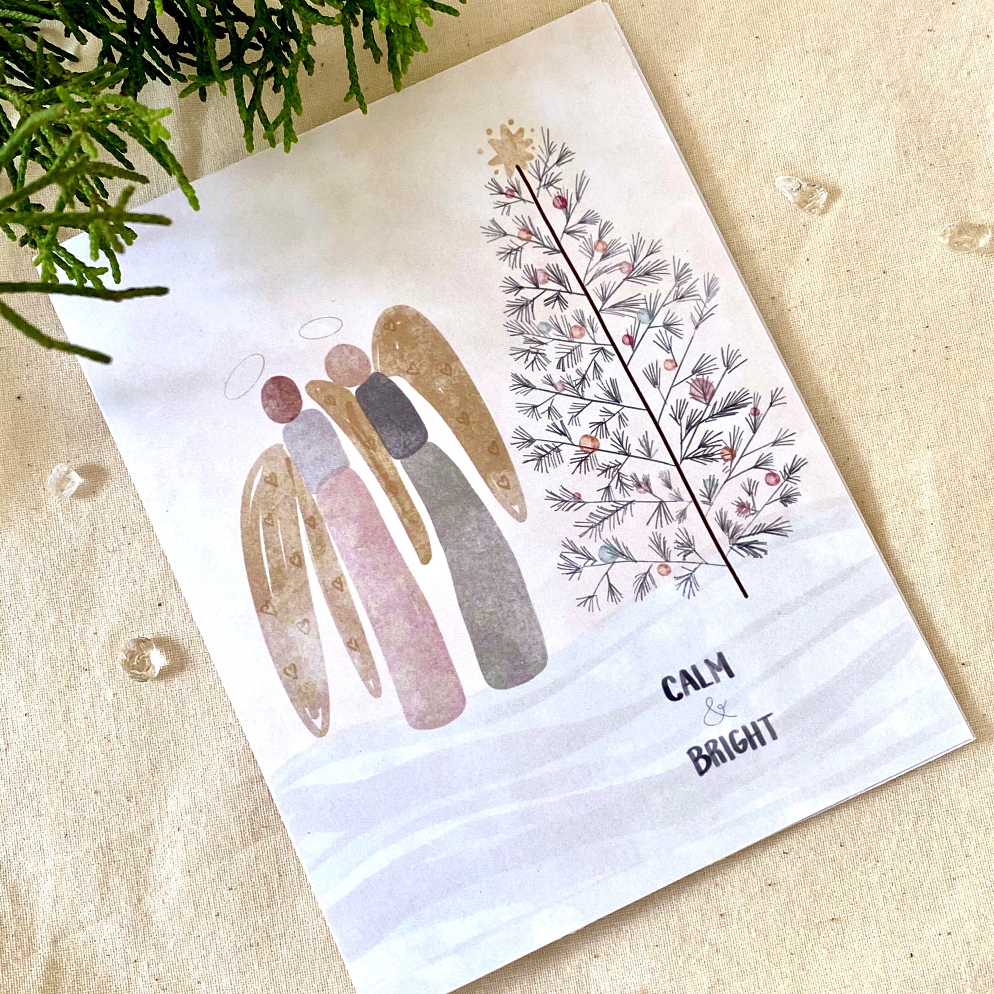 Angels deliver the blessings of the season, illuminating our hearts. All is calm. All is bright. Original hand drawn art. 4.25” x 5.5” vertical folded greeting card. Inside art and greeting as shown in above photo Each card...Read more