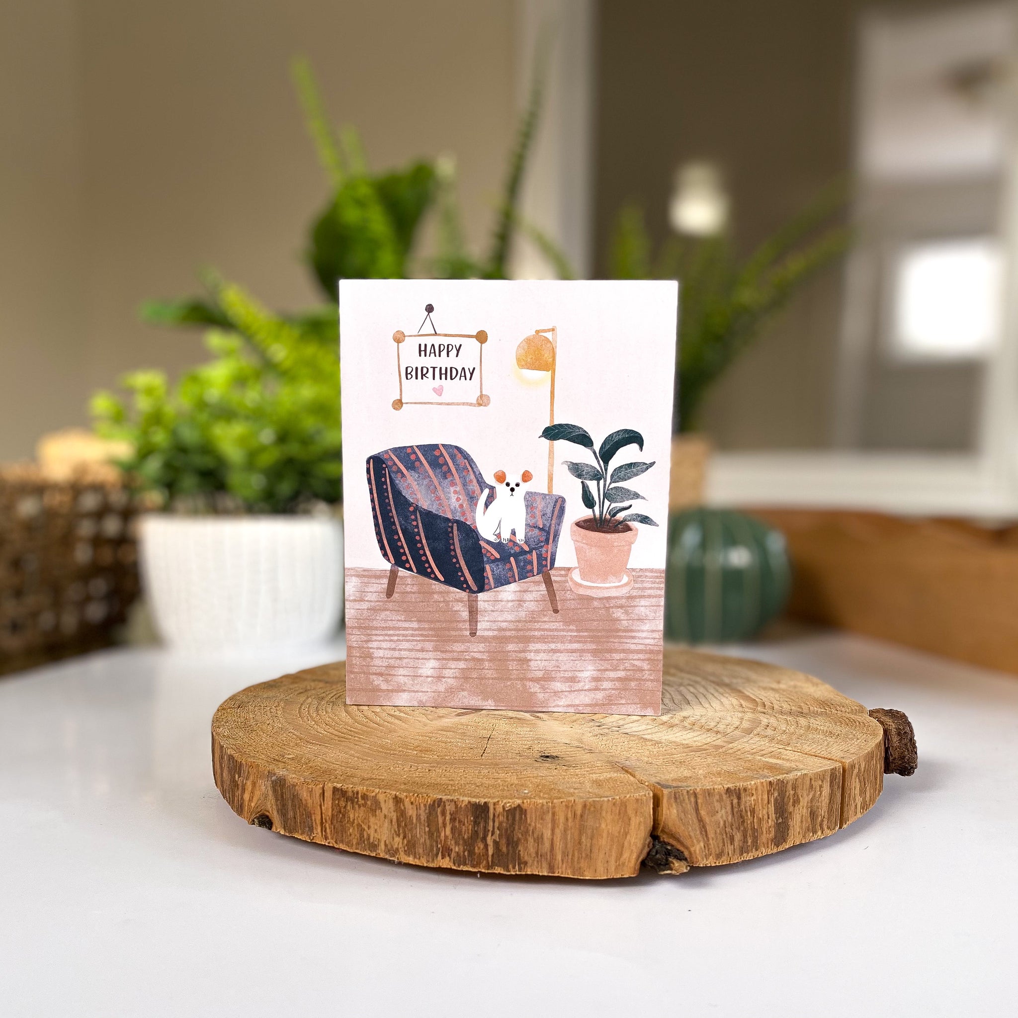 Say happy birthday to your favourite person with this adorable card! There's nothing cuter than coming home to the pup curled up on his fave chair...except maybe coming home to the cat :)