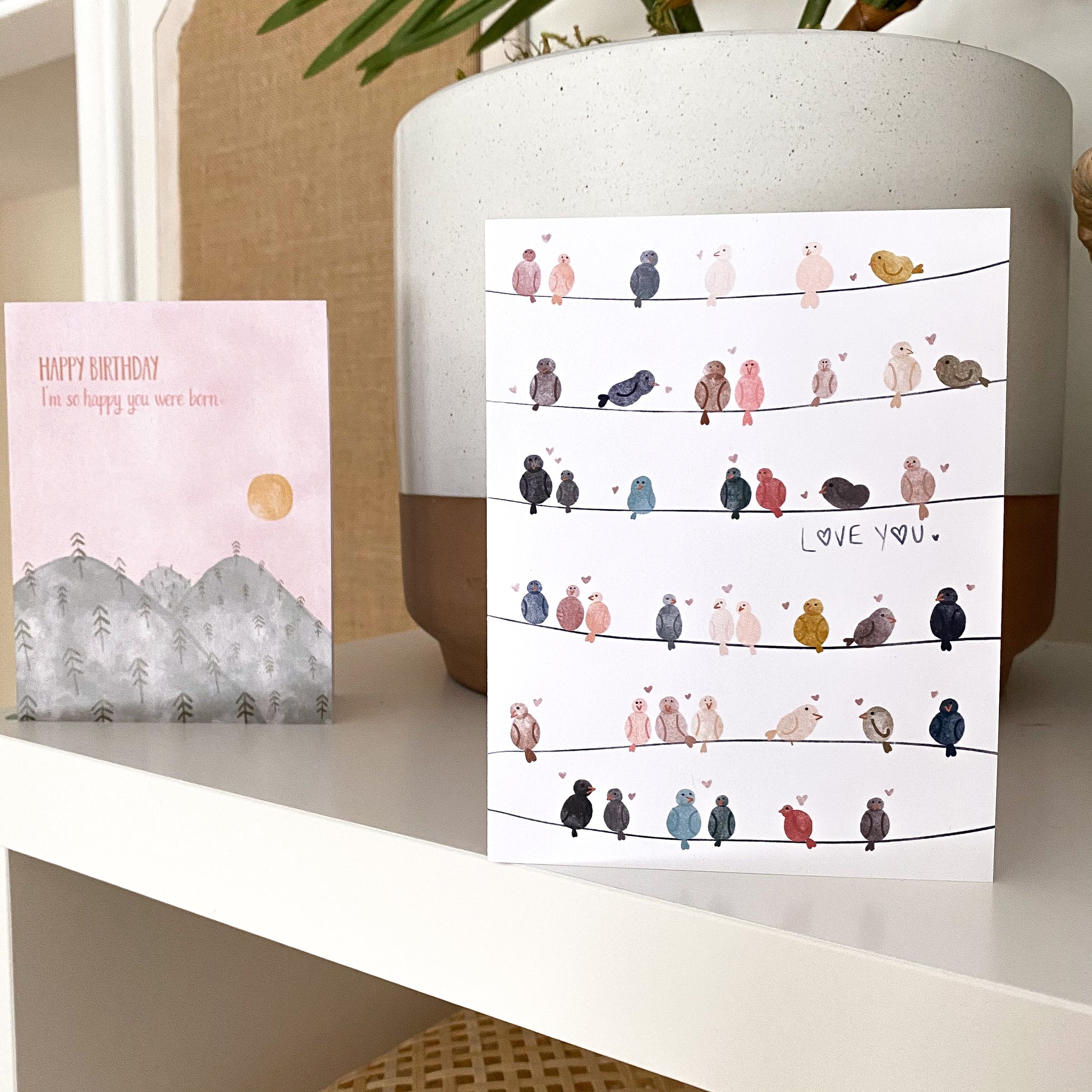 These sweet love birds are the perfect way to say I Love You to just about anyone! Original hand drawn art 4.25” x 5.5” vertical folded greeting card Blank inside Each card comes with a kraft envelope No returns,...Read more