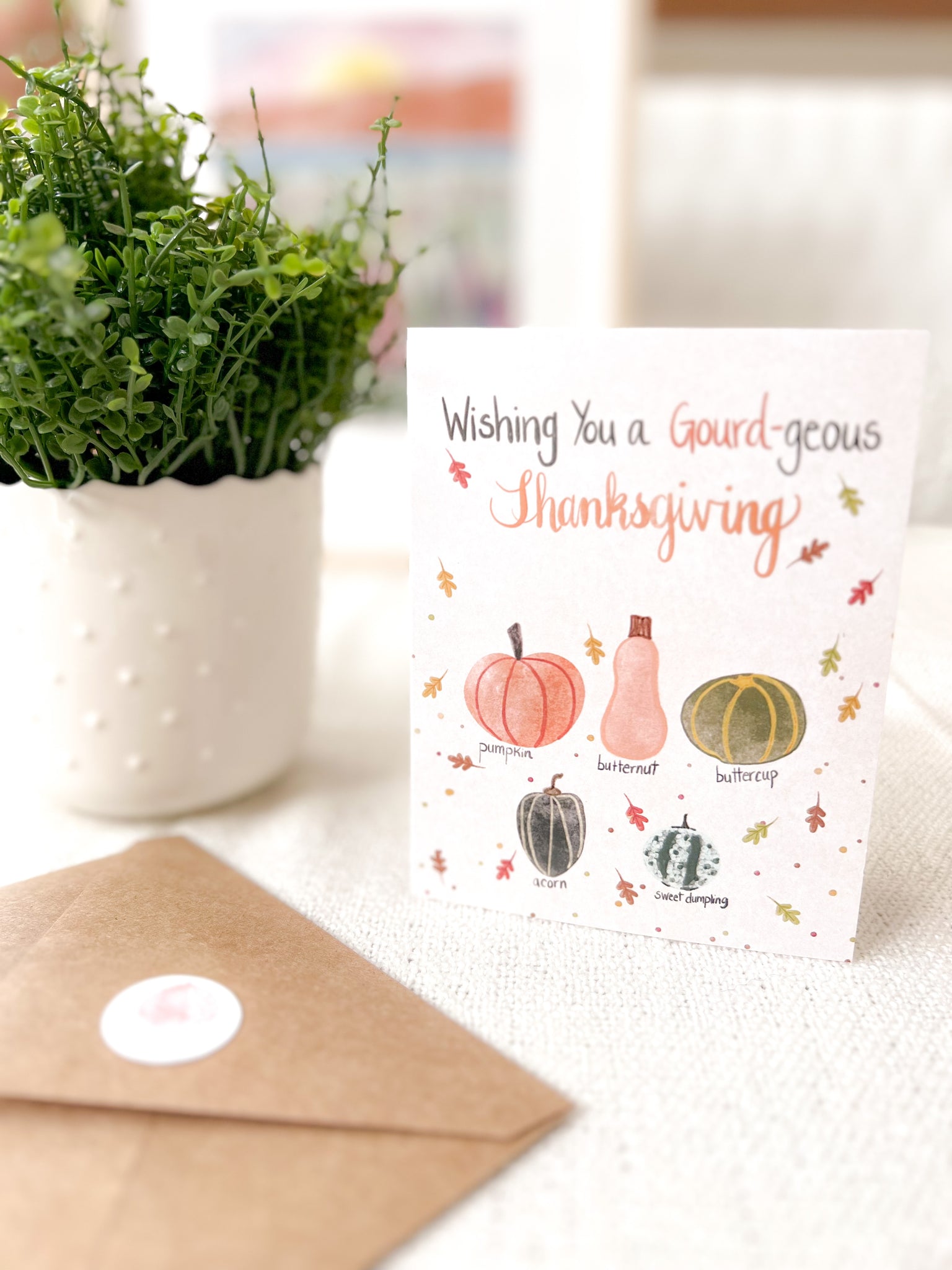 Wish your favourites a Happy Thanksgiving with our punny Thanksgiving card. 4.25” x 5.5” vertical folded greeting card Blank inside Each card comes with a kraft envelope. Hand drawn original art. No returns, exchanges, or refunds on greeting...Read more